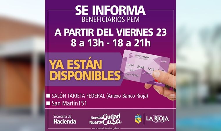 La Municipalidad de La Rioja, a través de la Secretaría de Hacienda, comunica a los beneficiarios del programa PEM que aún no tengan su tarjeta de débito, pueden pasar a retirarla por las oficinas de Tarjeta Federal, ubicadas en San Martín 151, en horario de 8 a 13 y de 18 a 21 horas.