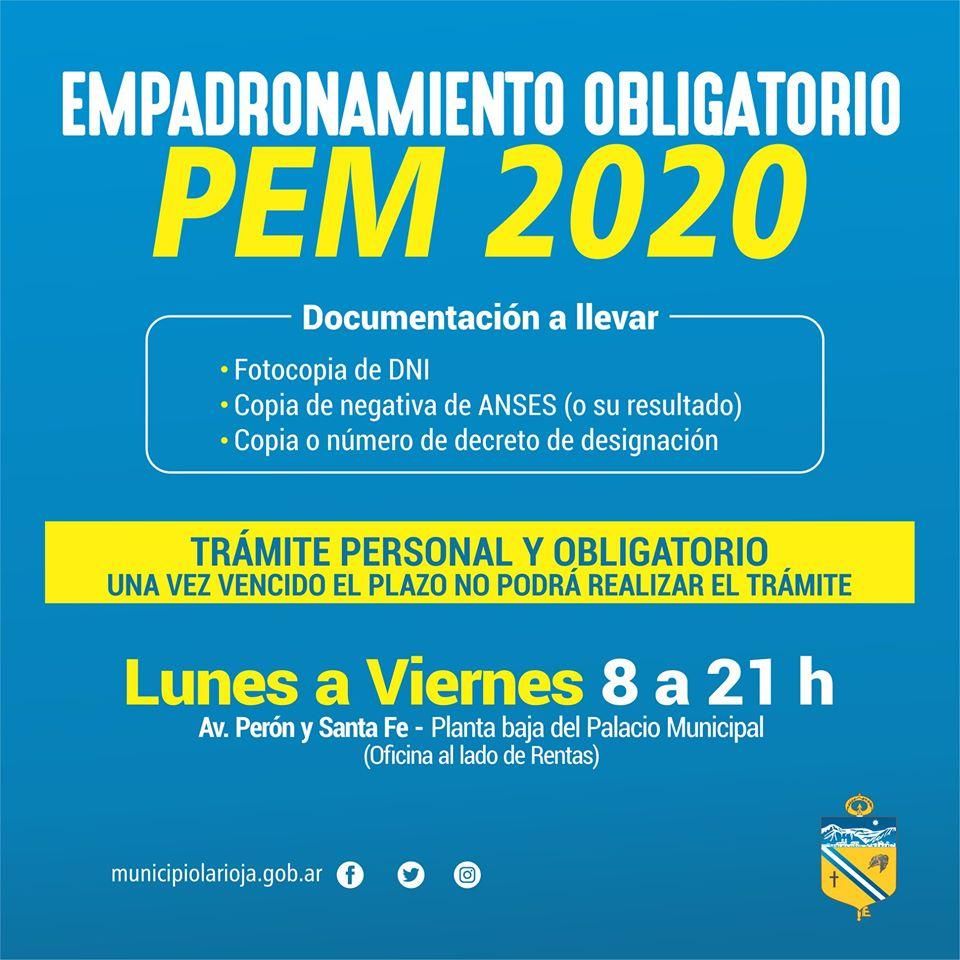 El trámite es personal y obligatorio, de no presentarse se dará de baja el beneficio. Los PEM deberán acercarse por la planta baja del Palacio Municipal en la oficina sobre avenida Perón esquina Santa Fe al lado de rentas, de 8 a 21 horas, horario corrido los días dispuestos para cada área.