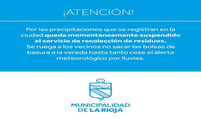 LA RIOJA.- La Municipalidad de La Rioja informa a los vecinos que hasta tanto cese el alerta meteorológica por las copiosas lluvias que se registraron en las últimas horas, queda suspendido el servicio de recolección de residuos domiciliarios, por lo cual se recomienda no sacar las bolsas de basura a la vereda para evitar inconvenientes.