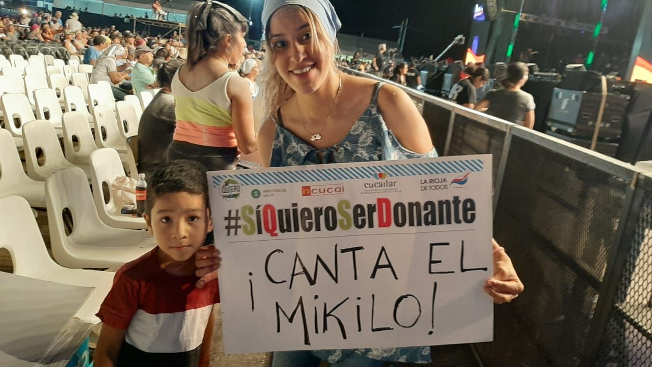 En la oportunidad regaló carteles para que el público presente exprese sus saludos en el festival mayor de los riojanos.