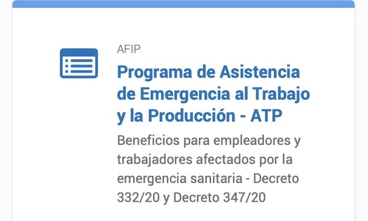 La AFIP habilitó, a través de la resolución general 4716, la posibilidad para los empleadores de solicitar el acceso a los beneficios del Decreto 332/2020 a través del servicio “Programa de Asistencia de Emergencia al Trabajo y la Producción - ATP” para el mes de mayo, al que se accede con clave fiscal. Los beneficios a los que se puede acceder son la postergación del pago de las contribuciones patronales con destino al sistema previsional (SIPA) o su reducción de hasta el 95% y el salario complementario que paga la ANSES a los trabajadores del sector privado correspondientes a este mes.