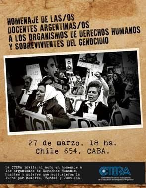 La Secretaria de Derechos Humanos de CTERA, realizará un homenaje y entregará reconocimientos, a l@s docentes, y a los organismos de Derechos Humanos y sobrevivientes del genocidio de todos los sindicatos docentes de la República Argentina, que conforman la CTERA. Estarán presentes Madres, Abuelas e HIJOS y la Liga Argentina por los Derechos del Hombre. Es un acto de unidad entre sectores y organizaciones.