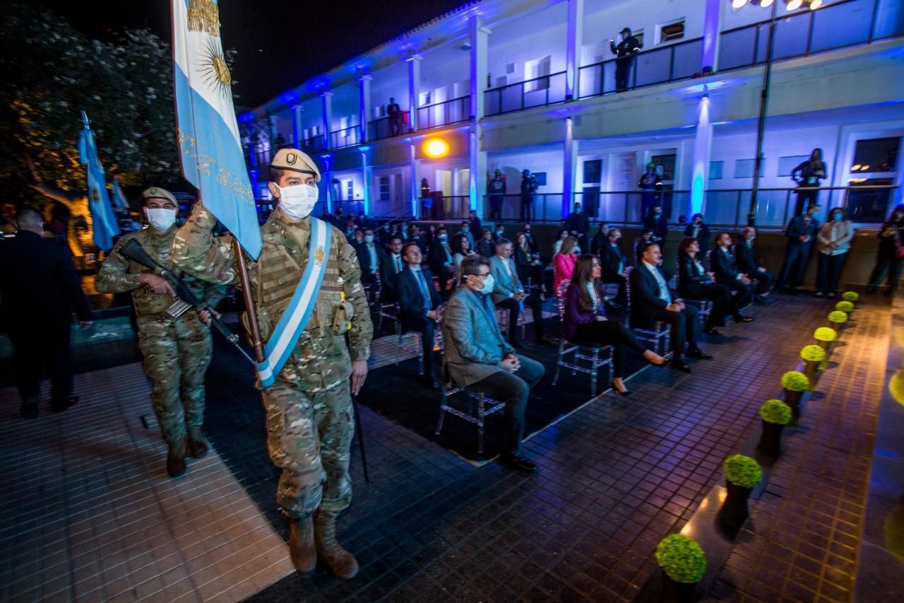 Cerca de las 12, hicieron su ingreso las banderas de ceremonial del Regimiento 15, la Policía de la Provincia, y bomberos Voluntarios, en tanto que Carlos Ferreyra se sumó para entonar el Himnos Nacional Argentino, mientras que un grupo de niños puso en su voz el himno de la provincia de La Rioja.