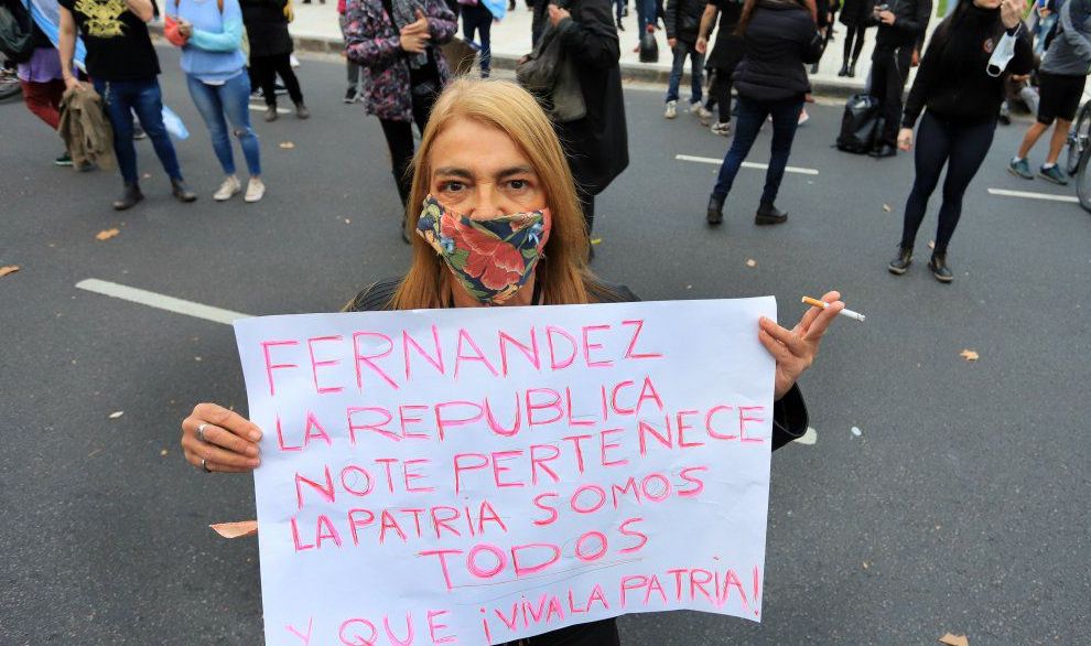 "La vacuna métansela en el orto", grita uno. "El barbijo hace daño", lanza otro. "Los muertos en Estados Unidos y Brasil son mentira", dice aquel y agrega que "no es como dice la prensa" porque "en esos países están mejor que en Argentina".
