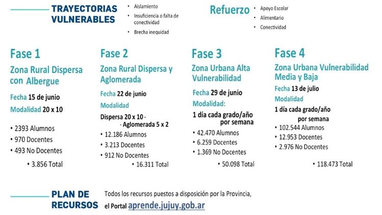Pese al anuncio público, el plan jujeño aún debe ser aprobado por Nación. El programa contiene un componente que va a contramano de lo que se baraja en el Consejo Federal de Educación (CFE): adelanta el receso de invierno para las próximas dos semanas y a partir del 15 de junio inicia un proceso gradual.