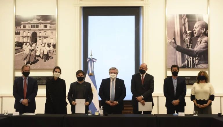 El presidente Alberto Fernández encabezó, desde Casa Rosada, la firma de una serie de convenios con los gobernadores de las provincias de Buenos Aires, Santa Fe y Entre Ríos para que adhieran al plan Argentina Construye con el objeto realizar obras de infraestructura sanitaria, de equipamiento y viviendas en el marco de la emergencia generada por la pandemia del coronavirus.