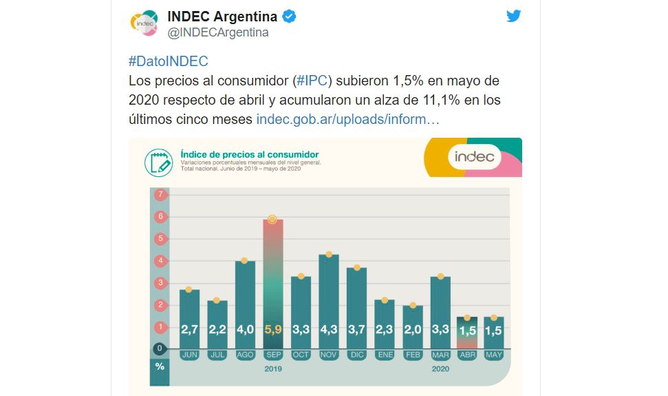 El Indec precisó además, que la categoría Regulados -que comprende a servicios públicos y determinadas actividades- mostró al cierre de mayo una baja de 0,1% respecto al mes anterior.
