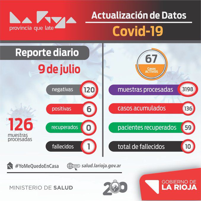 LA RIOJA.- Este jueves se procesaron 126 muestras, resultando 120 negativas para COVID-19 y seis positivas. Se trata de cinco mujeres de 71, 67, 55, 45 y 34 años y un hombre de 68 años, todos contactos estrechos.