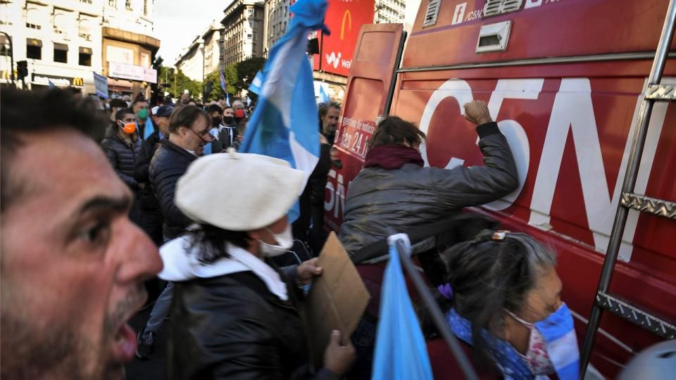 Hasta ahí era lo esperado pero en el Obelisco y alrededor del móvil de C5N la tensión comenzó a incrementarse. "La cuarentena ya pasó a segundo plano porque han destruído todas las variables de la economía", gritaba al micrófono de ese canal de noticias un joven libertario con el pañuelo celeste antiderecho como barbijo. "¡C5N, la puta que te parió!", empezó a escucharse de fondo de la entrevista. "Los kirchneristas son los que agreden a los medios, nosotros no tenemos nada que ver. Acá no hay gente violenta, a pesar de que los agredan", ensayó un oxímoron liberario antiderechos.