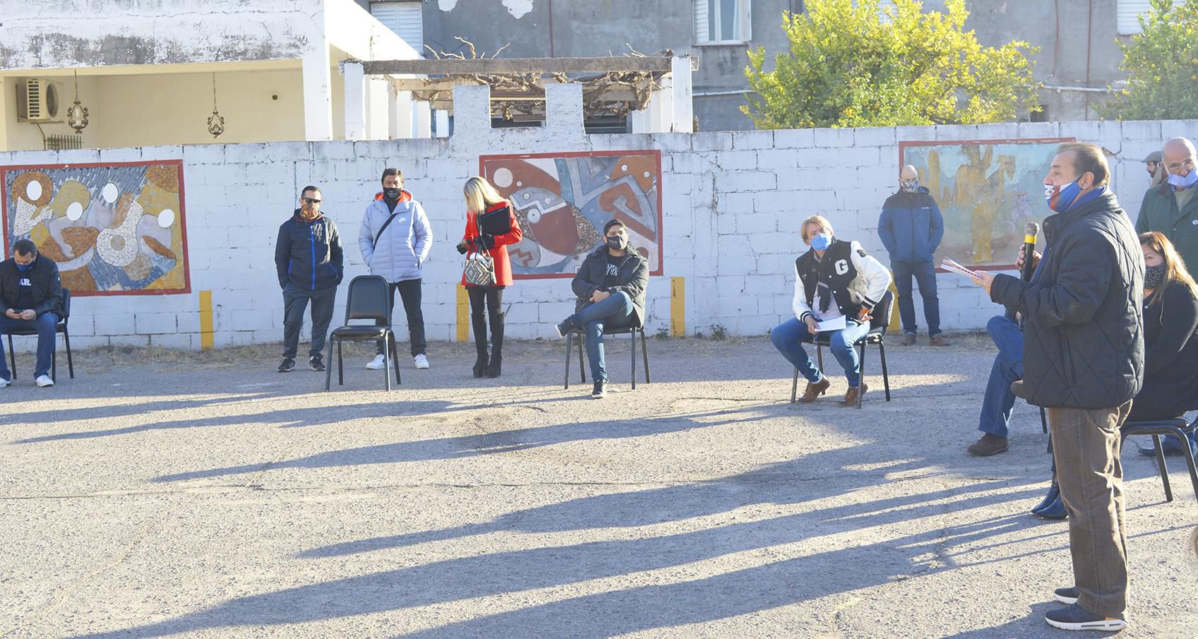 La reunión se realizó al aire libre y cumpliendo todos los protocolos necesarios. En este sentido se sanitizó a cada persona que ingresó en la reunión, al igual que el micrófono luego de cada intervención.