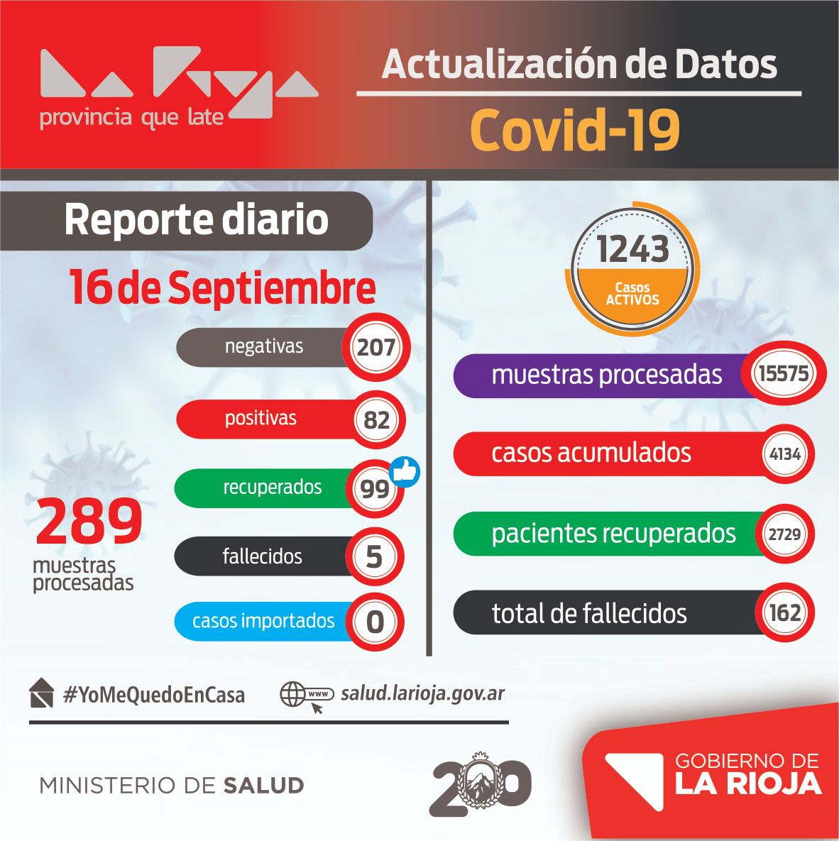 En estos momentos tenemos 4134 casos acumulados, hoy se recuperaron 99 personas, haciendo un total de 2729 recuperados, tenemos 1243 casos activos y 162 fallecidos.