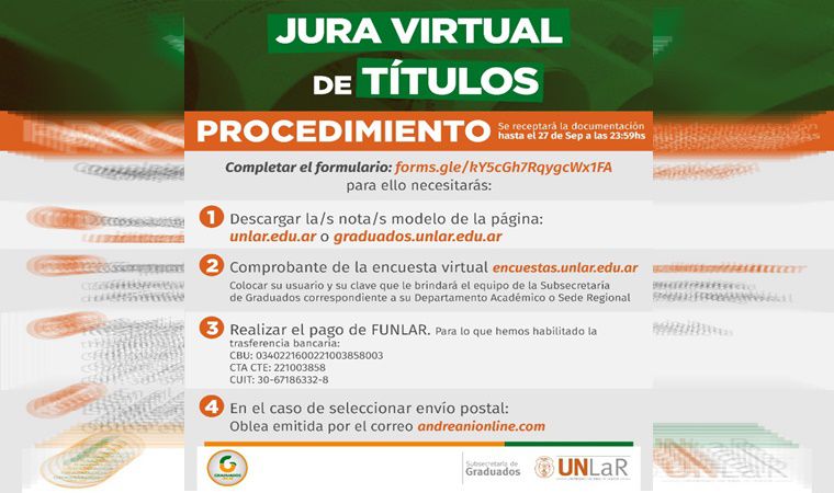 Al respecto, la subsecretaria de Graduados de la Casa de Altos Estudios, Cristina Uliarte -en diálogo con Radio UNLaR 90.9-, adelantó que la segunda instancia de entrega de títulos virtual se dividirá en dos turnos “a fin de que todos los graduados y graduadas aparezcan en pantalla al momento de la jura”; indicó, y agregó: “el primero dará inicio a las 9:30 y el segundo a las 11:30 de la mañana” del miércoles 30 de septiembre.
