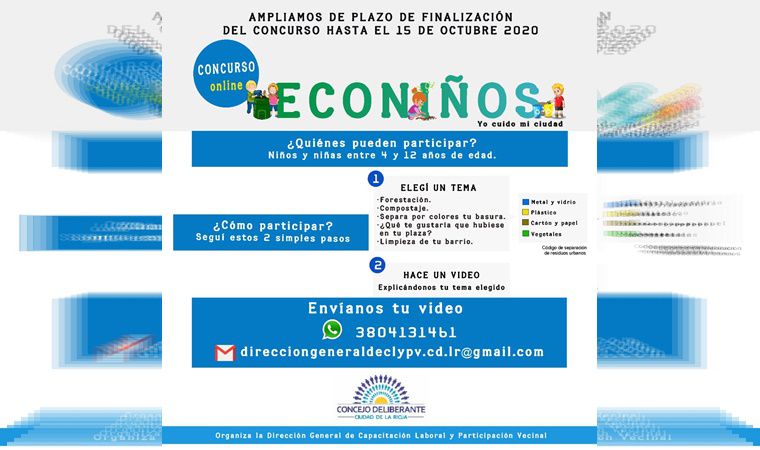 El concurso "EcoNiños: yo cuido mi ciudad" está organizado por la Dirección de Capacitación Laboral y Participación Vecinal e invita a todos los niños y niñas de entre 4 y 12 años a participar del certamen. El objetivo es concientizar a la sociedad sobre el cuidado del ambiente, por medio de videos informativos referidos a una temática ecológica. Puede participar la niñez que tenga entre 4 y 12 años y deberán escoger entre las siguientes temáticas: Forestación; Compostaje; Separa de los residuos reciclables por colores tu basura; ¿Qué te gustaría que hubiese en tu plaza?; Limpieza de tu barrio.