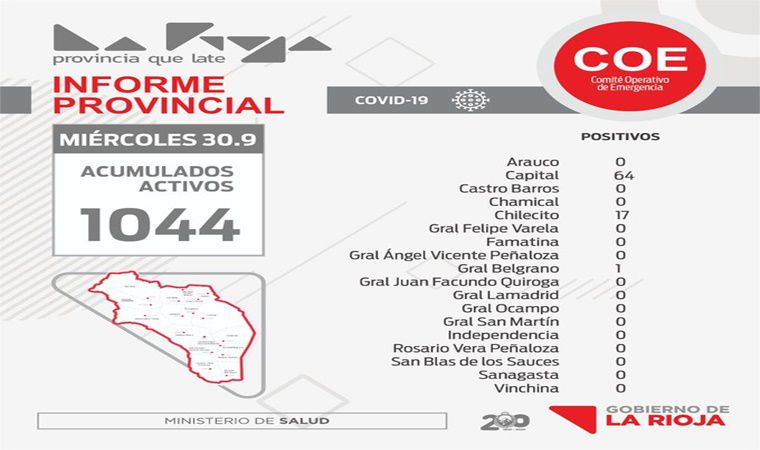 El ministerio de salud de La Rioja informó mediante su cuenta oficial de twitter, que en la jornada de este miércoles 30 de septiembre se confirmaron 82 casos y un fallecido con Covid-19.