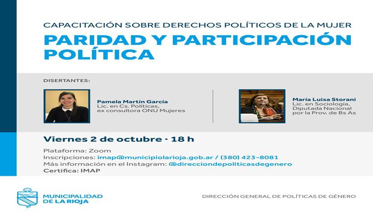 La misma se realizará a través de zoom, y los interesados podrán inscribirse mediante el mail imap@municipiolarioja.gob.ar o al número 380-4238081. La charla estará a cargo de las disertantes María Luisa Storani y Pamela Martín García, Licenciadas en Ciencias Políticas de la UBA; grandes activistas feministas, militantes políticas y ex consultoras para ONU Mujeres, Oficina Regional para el Primer Plan de Igualdad y Oportunidades de Argentina –PIOD-.