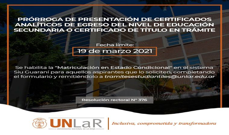 También, a través de la misma resolución rectoral se autoriza a la Secretaría de Asuntos Académicos para la implementación en el Módulo Siu Guarani de la “Matriculación en Estado Condicional”, destinada solamente para aquellos aspirantes que lo soliciten completando el formulario confeccionado para tal fin y remitiéndolo a tramitesestudiantes@unlar.edu.ar.