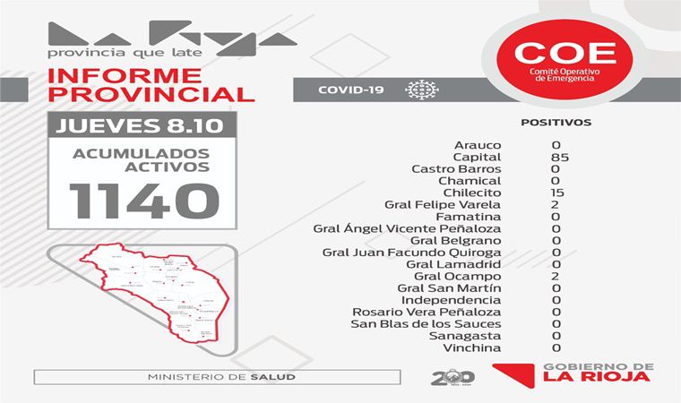 LA RIOJA.- En el segundo informe indicaron que, se procesaron 146 muestras, resultaron 97 negativas y 49 positivas para COVID-19. Corresponden 1 a Nonogasta, 4 a Chilecito, 2 a Catuna y 42 a Capital. El total del día: 104 muestras positivas. Hoy fallecieron cuatro pacientes COVID-19 positivos.