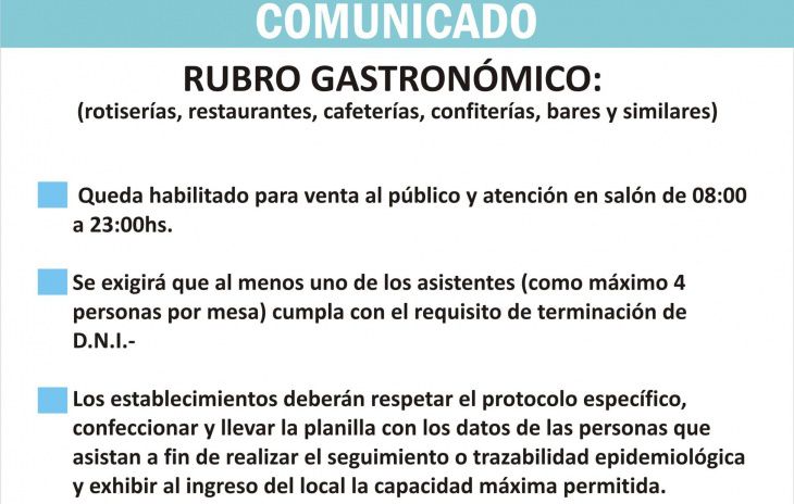 Según se informó, la apertura será en el horario de 8 a 23, en el cual estará permitida la actividad en rotiserías, restaurantes, bares, confiterías y similares.