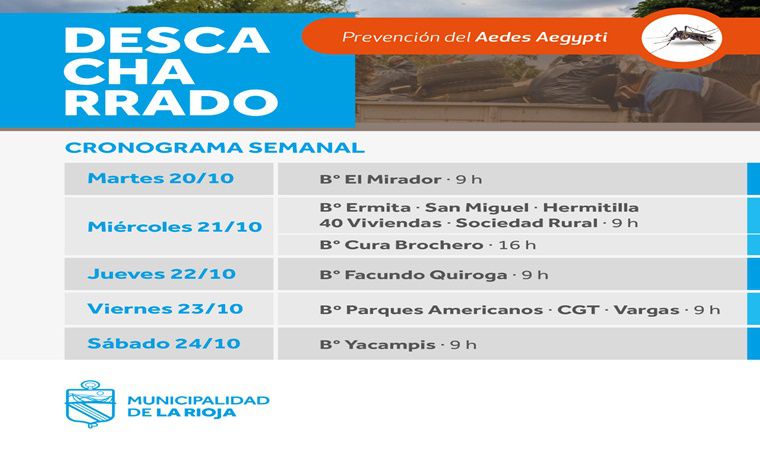 El día martes 20 de octubre a las 9, las cuadrillas municipales recorrerán el barrio El Mirador. El miércoles 21 el operativo inicia a las 9 en el barrio Ermita, luego continúa por las calles de los barrios la Ermitilla, San Miguel, 40 Viviendas, Sociedad Rural en la zona este de la ciudad. También el mismo día se visitará el barrio Cura Brochero a las 16 horas.
