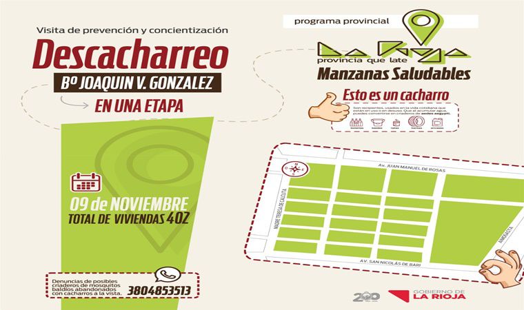 LA RIOJA.- En el marco del programa Manzanas Saludables del Gobierno Provincial, este lunes 9 de noviembre, de 8 a 13, se realizarán tareas de prevención, desmalezamiento y descacharreo en el Barrio Joaquín V. González de la ciudad Capital.