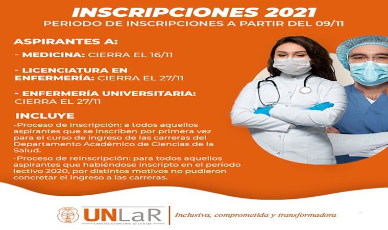 Desde el Departamento Académico de Ciencias de la Salud de la UNLaR informan que, desde este lunes, 9 de noviembre, ya se encuentran abiertas las inscripciones para el ciclo 2021.