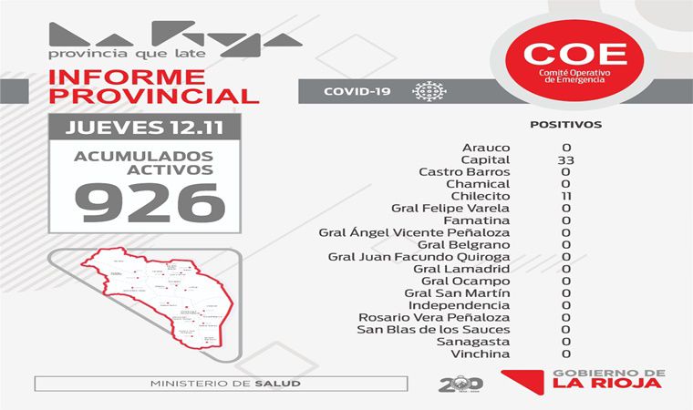En tanto que en el primer informe se procesaron 83 muestras de las cuales resultaron 64 negativas y 19 positivas para COVID-19, corresponden 9 a Capital, 9 a Chilecito y 1 a Nonogasta.