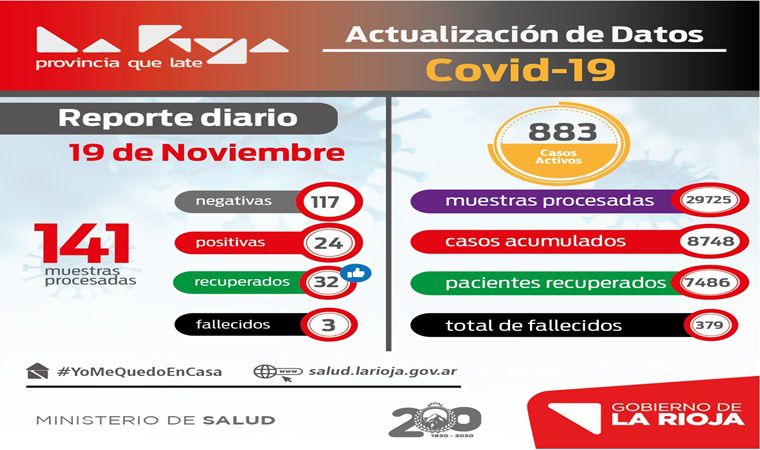 En estos momentos tenemos 8748 casos acumulados, hoy se recuperaron 32 personas, haciendo un total de 7486 recuperados, tenemos 883 casos activos y 379 fallecidos.