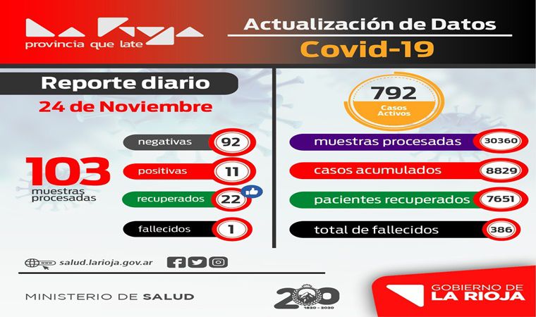 En estos momentos La Rioja tiene 8829 casos acumulados, hoy se recuperaron 22 personas, haciendo un total de 7651 recuperados, hay 792 casos activos y 386 fallecidos.
