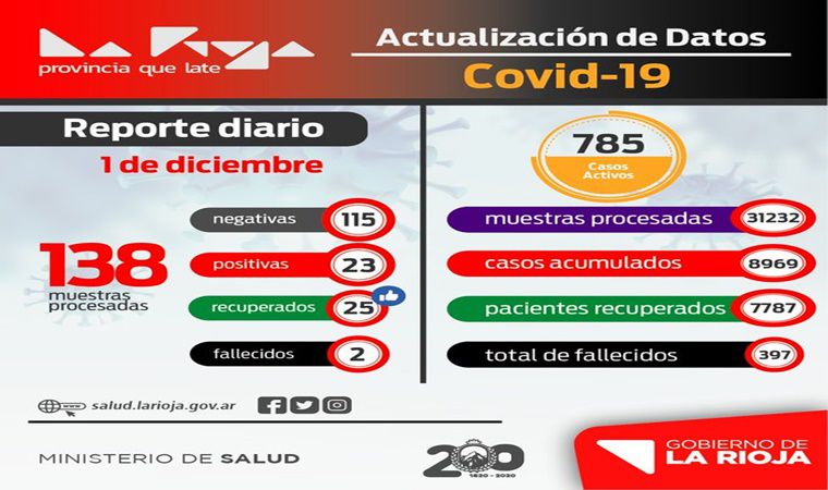 LA RIOJA.- Desde el Ministerio de Salud de la Provincia se informó que se procesaron 138 muestras, de las cuales 115 resultaron negativas y 23 positivas para COVID-19. Son 15 mujeres y 8 hombres.