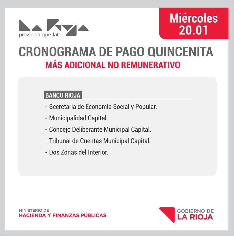 Las reparticiones incluidas en el cronograma de pago de este miércoles son: Secretaría de Economía Social y Popular, Municipalidad Capital, Concejo Deliberante de Capital, Tribunal de Cuentas Municipal de Capital y dos zonas del interior.