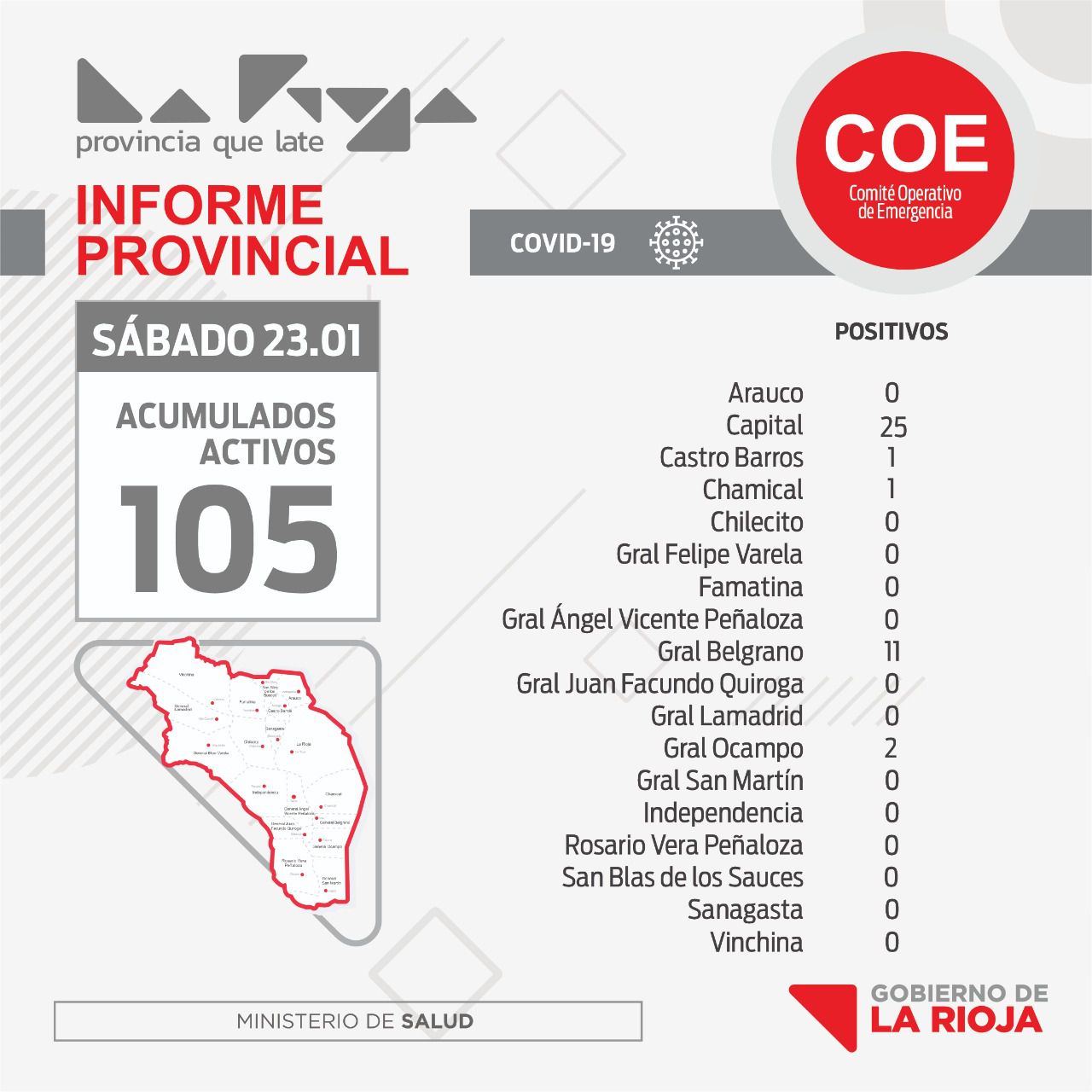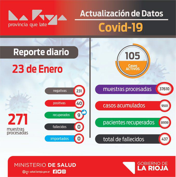 Los mismos corresponden 25 a Capital, 11 a General Belgrano, 2 a General. Ocampo, 1 a Castro Barros y 1 a Chamical. De los casos positivos son importados, regresaron 2 de Bs As y 3 de Carlos Paz. Se trata de 16 mujeres y 24 hombres.