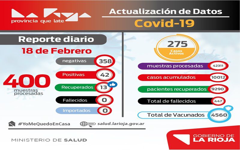 De esta manera, La Rioja tiene 10.012 casos acumulados, con un total de 9.290 recuperados, 275 casos activos y 447 fallecidos.