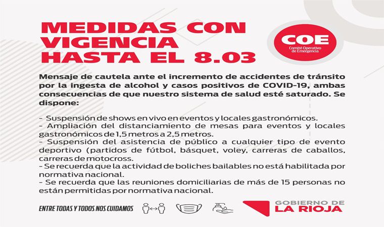 Entre las medidas adoptadas a partir del día de hoy se decidió suspender los shows en vivo en eventos y locales gastronómicos, y ampliar el distanciamiento de mesas para eventos y locales gastronómicos de 1,5 metros a 2,5 metros.