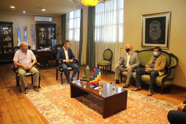 El rector de la UNLaR, Fabían Calderón, y el secretario a cargo de Asuntos Financieros, Carlos Sant, recibieron este miércoles al vicepresidente, al secretario titular y al gerente comercial superior del Banco Rioja, Marcelo Becerra, Orlando Gómez y Ricardo Bestani –respectivamente-, con la finalidad de trabajar en pos de los miembros de la comunidad universitaria accedan a los servicios de la entidad bancaria provincial.