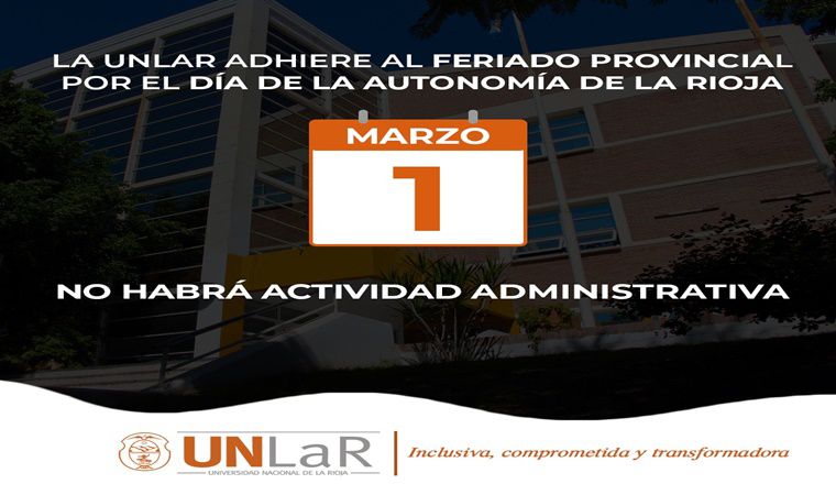 En el marco de la Ley Provincial Nº 10.242 que establece como feriado provincial al día 1 de marzo con motivo de declararse al mismo como Día de la Autonomía Provincial, el rector de la UNLaR, Fabián Calderón, resolvió adherir a la jornada conmemorativa. Consecuentemente, se estableció la suspensión, en el ámbito de la Universidad Nacional de La Rioja, de la totalidad de las actividades administrativas que se desarrollan tanto en Sede Capital como en las demás sedes y delegaciones del interior de la Provincia.