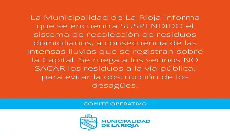 LA RIOJA.- En este sentido, desde la comuna se solicita a los vecinos no sacar la basura a la vía pública para evitar la obstrucción de los desagües. Se esperan valores de precipitación acumulada de entre 20 mm y 50 mm.