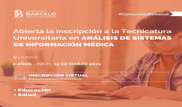 Atendiendo a esta necesidad, la Fundación Barceló amplía su oferta académica ofreciendo una formación específica de pregrado en la sede de La Rioja con una duración de 2 años que comienza el 5 de abril, la nueva Tecnicatura Universitaria en Análisis de Sistemas de Información Médica. La modalidad de cursada será presencial, con un 20% de actividades a lo largo de la carrera que se desarrollarán de manera virtual. Mientras permanezcan las medidas vigentes debido al contexto epidemiológico y sanitario, el dictado de clases será en modalidad virtual.