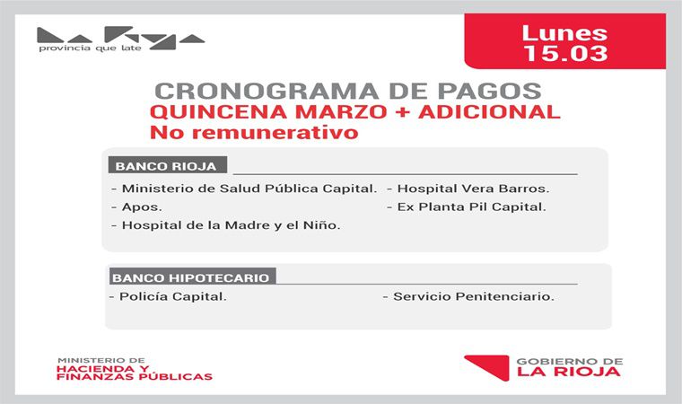 El gobierno de La Rioja, mediante el ministerio de Hacienda y Finanzas Públicas, informó que el lunes 15 de marzo comenzará el pago de la quincenita más el adicional no remunerativo, que se otorga a los empleados públicos.