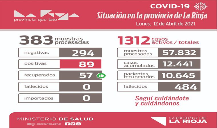 El Ministerio de Salud provincial informó este lunes que se procesaron 383 muestras, de las cuales 294 son negativas y 89 positivas para COVID-19. Se trata de 28 mujeres y 61 hombres.