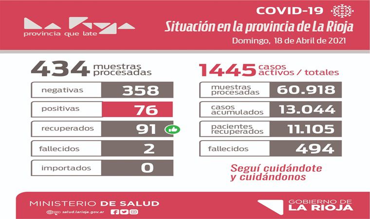 Las mismas corresponden 28 a Capital, 23 a Chilecito, 15 a Arauco, 2 a Castro Barros, 2 a San Martín, 2 a Juan Facundo Quiroga, 2 a General Ocampo, 1 a Felipe Varela y 1 a General Belgrano. Se trata de 35 mujeres y 41 hombres. Comunicaron también el fallecimiento de dos pacientes positivos de Covid-19.