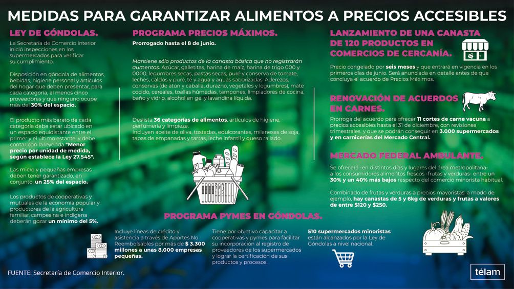 El Gobierno avanzó en la última semana en la puesta en marcha de la Ley de Góndolas y el lanzamiento de una canasta de 120 productos que estará disponible en comercios de cercanía a partir de junio, al tiempo que renovó acuerdos en carnes y Precios Máximos con el objetivo de garantizar el acceso a los alimentos a precios accesibles.