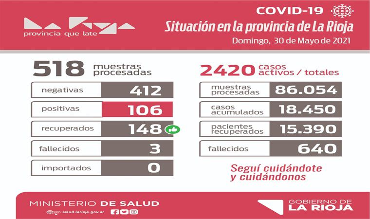 El Ministerio de Salud Provincial informó este domingo que se procesaron 518 muestras, de las cuales 412 son negativas y 106 positivas para el virus respiratorio. Se trata de 58 mujeres y 48 hombres.