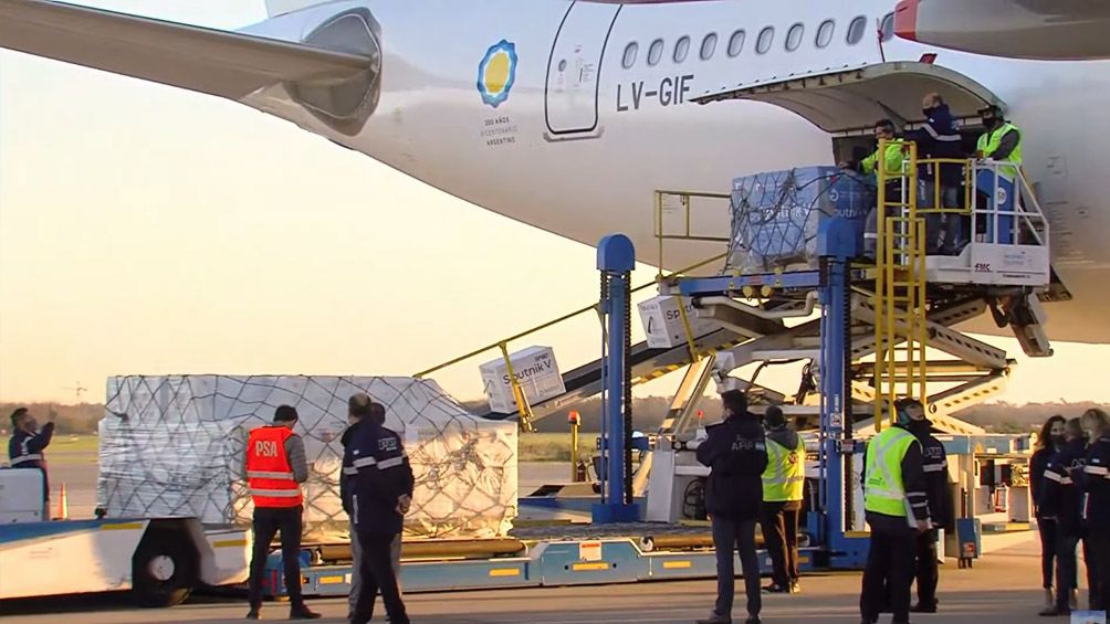 La aeronave Airbus 330-200, matrícula LV-GIF, con el número de vuelo AR1063 aterrizó a las 16,56 en el aeropuerto internacional de Ezeiza, proveniente de Moscú, con 400.000 dosis del componente 2 de Sputnik V, 81.850 del componente 1 y 300 litros del principio activo para comenzar la producción local de la vacuna.