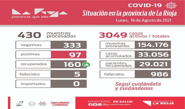 El Ministerio de Salud Provincial informa este lunes que se procesaron 430 muestras, de las cuales 333 son negativas y 97 positivas para COVID-19. Se trata de 53 mujeres y 44 hombres.