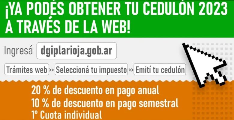 Para proceder con el trámite, los interesados deberán contar con el cedulón que lo obtendrán al ingresar a la página mencionada (www.dgiplarioja.gob.ar), luego seleccionar la opción “Trámites Web”, posteriormente marcar el impuesto a pagar y hacer clic en la opción “Emitir cedulón”.