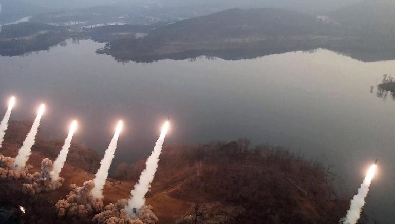 Las imágenes divulgadas por la agencia de prensa estatal KCNA mostraron al menos seis misiles lanzados a la vez por una unidad Hwasong, concebida para "misiones de ataque".