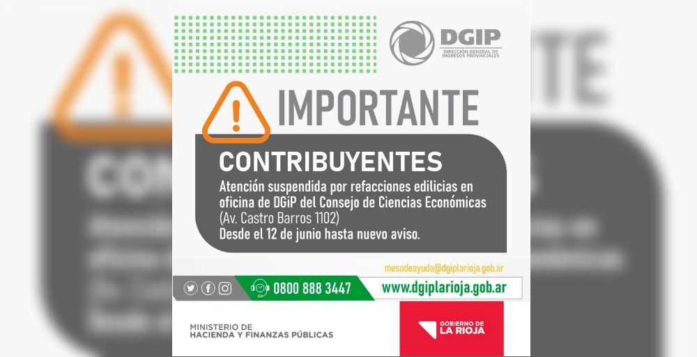 El Ministerio de Hacienda y Finanzas Públicas a través de la Dirección de Ingresos Provinciales informa que la oficina descentralizada, ubicada en el Consejo de Ciencias Económicas (Av. Castro Barros 1102) estará cerrada desde este lunes 12 de junio hasta nuevo aviso debido a refacciones que se realizarán en el edificio.