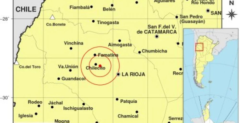 En ese sentido, el epicentro fue situado a 57 km al noroeste de la ciudad de La Rioja y tan solo 12 km al este de la ciudad de Chilecito.