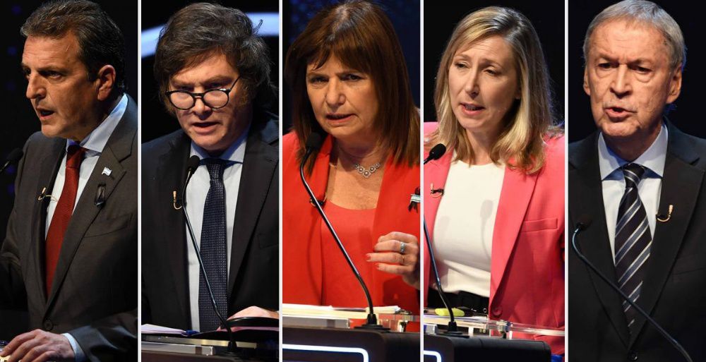Sergio Massa (Unión por la Patria, UxP), Patricia Bullrich (Juntos por el Cambio, JxC), Javier Milei (La Libertad Avanza, LLA), Juan Schiaretti (Hacemos por Nuestro País, HNP) y Myriam Bregman (Frente de Izquierda y Trabajadores-Unidad, FIT-U) debatieron en el salón de actos de la Facultad de Derecho de la Universidad de Buenos Aires (UBA) sobre los temas "Seguridad"; "Trabajo y producción"; y "Desarrollo humano, vivienda y protección del ambiente", éste último elegido por la ciudadanía.