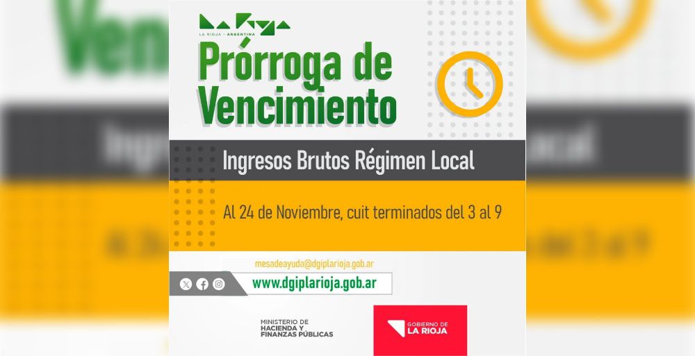 LA RIOJA.- El Ministerio de Hacienda y Finanzas Públicas a través de la Dirección General de Ingresos Provinciales (DGIP), informa que se decidió prorrogar hasta el 24 de noviembre el vencimiento del Impuesto sobre los Ingresos Brutos Régimen Local con CUIT terminados en 3,4,5,6,7,8, y 9.